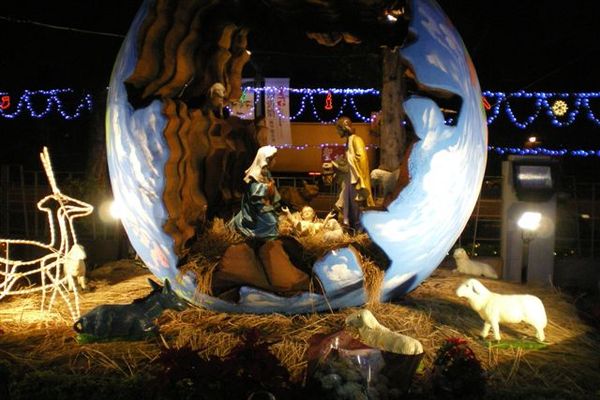 旁邊佈置了一個耶穌誕生時的羊槽,每年都有,不過今年還特地將外面設計成地球的形狀